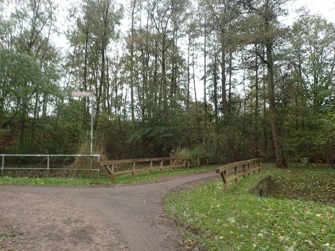 Niederschleems Rote Brücke 12.34 Uhr / Km 26,0 Nach gut 21 Kilometern war der Lauf auf dem 2. Grünen Ring hier (zumindest vorerst) vorbei. Nun hatten wir keine schönen Markierungen mehr. |