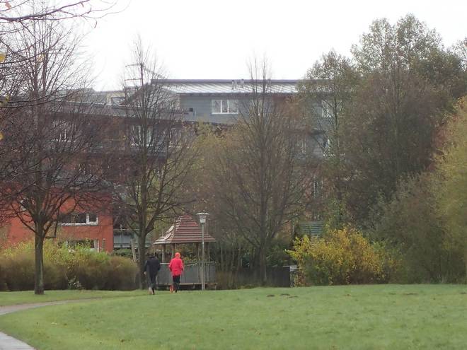 Seebek 11.06 Uhr / Km 11,3 Nun ging es durch Steilshoop. Zum Glück nur hier durch den grünen Teil des sonst nicht so schönen Stadtteils. |