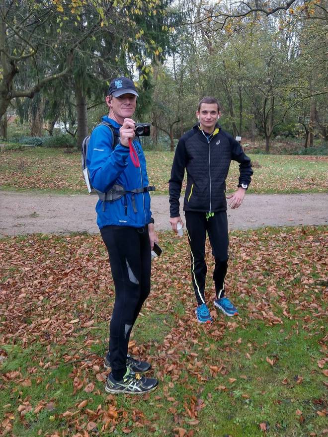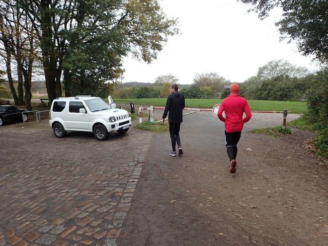 Trabrennbahn 11.28 Uhr / Km 15,2 Das war überraschend. Da vor mir liefen Rico und Tobias. Ganz so nahe waren sie nicht. Auf der ehemaligen Rennbahn konnte man weit gucken und meine Kamera hat einen guten Zoom... aber sie waren da. |