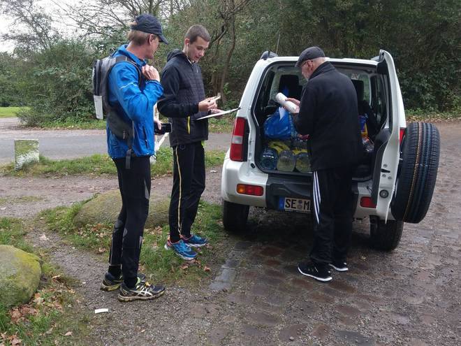 Eichenlohweg Friedhof Ohlsdorf 10.53 Uhr / Km 8,9 Der erste von insgesamt vier Verpflegungspunkten war hier hinter dem Friedhof erreicht. Die Verpflegungspunkten waren gleichzeitig auch Check-Punkte, wo man sich mit der jeweiligen Zeit in eine Liste eintragen mußte. Sonst gab es zwei Strafstunden. Immerhin nicht zwingend ein DNF. |