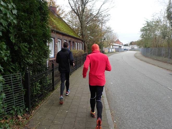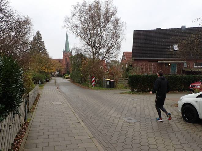 St. Nikolai Kirche 12.58 Uhr / Km 30,0 Noch ein letztes Foto. Dann konnte es weiter gehen. Bald drei Stunden waren wir nun unterwegs und es waren noch 17 Kilometer bis ins Ziel. Ob wir da unter fünf Stunden ankommen würden? Das wäre schon nett gewesen. Wenn es auch nicht zwingend war. Aber irgendwie wollten wie alle drei bald nach Hause. Daß ausgerechnet wir Drei das Feld anführten, war eigentlich ein Witz. Wir Drei waren auch die, die am lautesten wegen Müdigkeit oder Erkältung über Absage oder Abbruch geredet hatten. Aber auf der Strecke war plötzlich alles gut. Meine Erkältung und auch meine Magenprobleme schienen wir weggeblasen. Foto: Tobias |