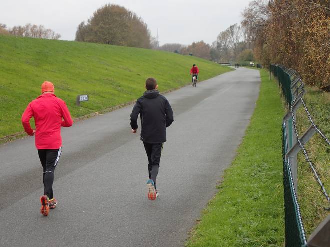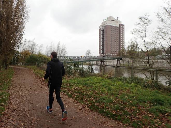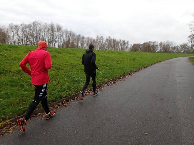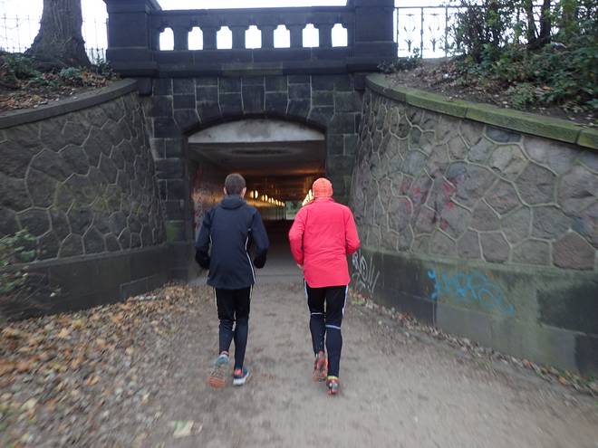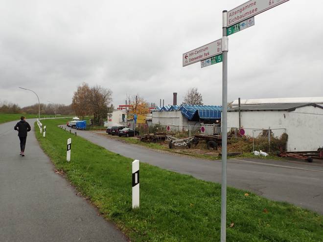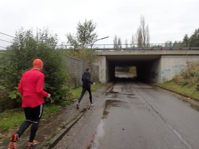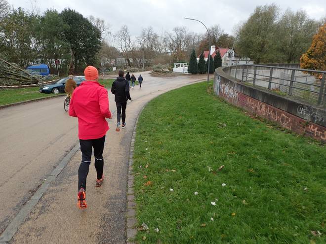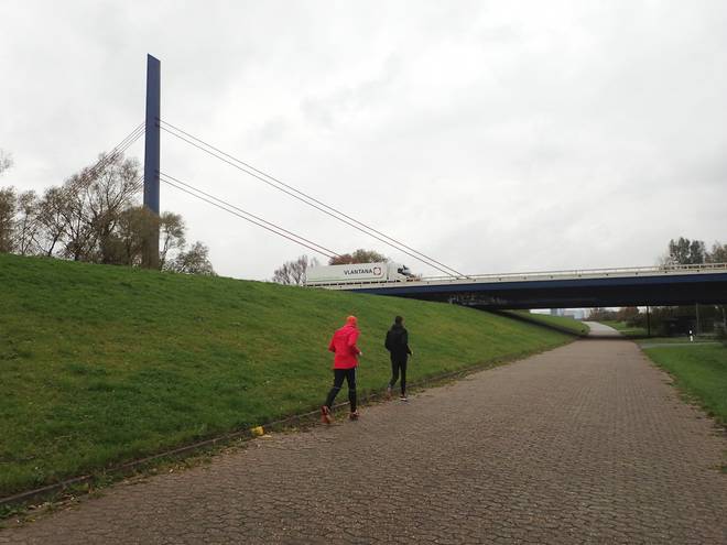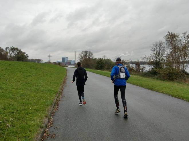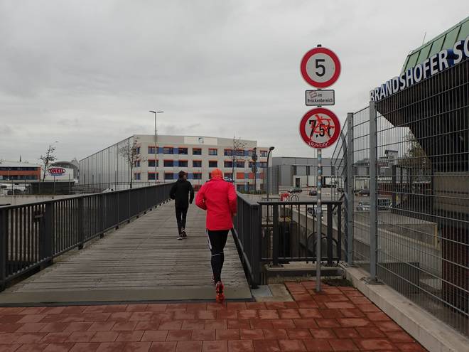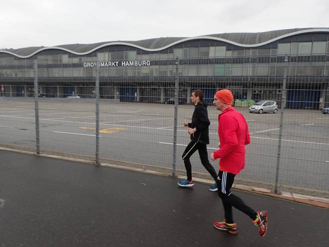 Hochwasserschutzanlage Großmarkt 13.52 Uhr / Km 38,5 Immer so zwischen Zaun und Wasser war auch nur mäßig spannend, aber wir kamen voran und wir liefen gut und flott, wenn gleich Rico ganz offenbar auch schneller hätte laufen können. |