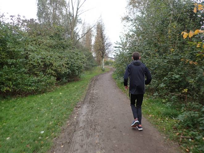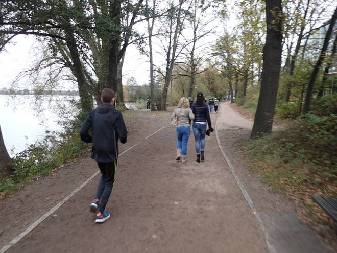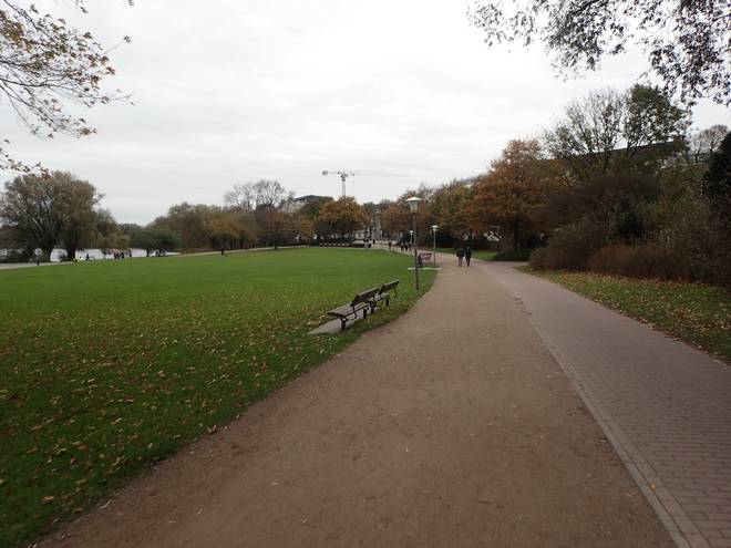An der Alster 14.36 Uhr / Km 45,3 Es war schon ein seltsames Gefühl, einen Ultramarathon auf derselben Strecke zu laufen, wo man regelmäßig seine Trainingsläufe macht. Beim Hamburg-Marathon läuft man hier wenigstens noch auf der Straße hier rechts hinter den Büschen. |