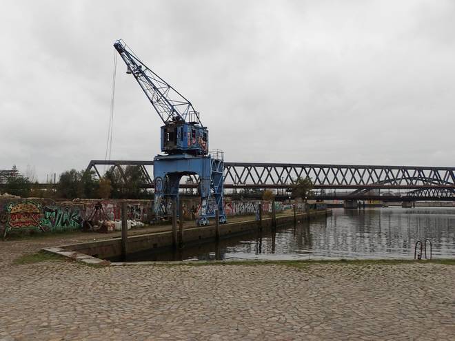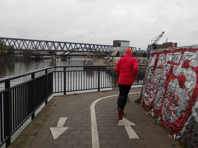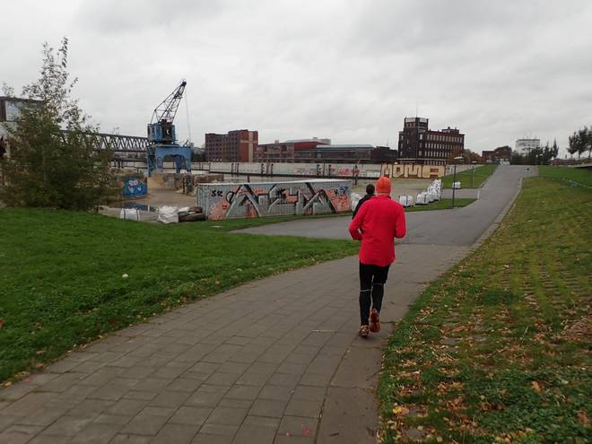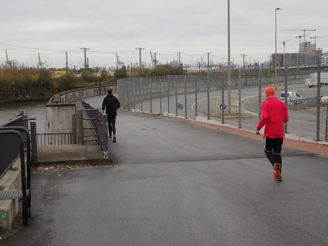 Oberhafenkanal 13.45 Uhr / Km 37,4 Nun liefen wir in den Hafen rein. Das Gebiet hatte ich schon hunderte Male von der S-Bahn oder dem Zug aus gesehen, aber durchgelaufen war ich hier noch nie. |
