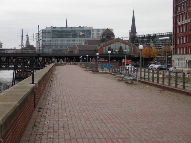 Hochwasserschutzanlage Großmarkt 13.57 Uhr / Km 39,4 Allmählich näherten wir uns der Speicherstadt. |