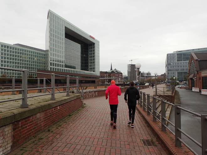 Zollkanal 14.06 Uhr / Km 40,9 Die Speicherstadt entlang machten Tobias und ich eine Menge Fotos. Das kostete etwas Zeit, aber so wie wir unterwegs waren, würden wir auch so locker unter fünf Stunden ins Ziel kommen. |