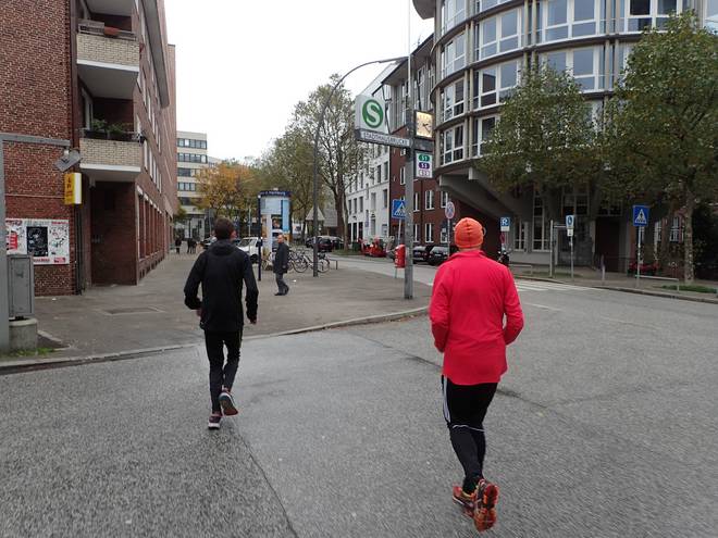 Entenwerder Stieg 13.38 Uhr / Km 36,3 Wir hielten unser Tempo sehr konstant. Rechnet man die Verpflegungspausen raus, liefen wir netto so um 5:55 Min/Km. |