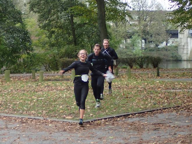 Bei der St. Gertrud Kirche 14.49 Uhr 2:32 Minuten nach uns kamen Kathin und Matthias ins Ziel. Wir hatten gedacht, wir hätten einen deutlicheren Vorsprung. Die Zwei hatten sich aber je eine Zwei-Stunden-Strafe eingehandelt, weil sie am vierten Verpflegungsstand vorbei gelaufen waren. |