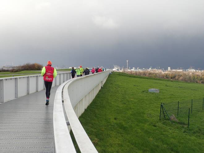 Runde 10 13.53 Uhr / Km 8,5 Während wir oben auf dem Horizontweg immer noch in der Sonne liefen, zogen schwarze Wolken über das Hamburger Stadtgebiet. |