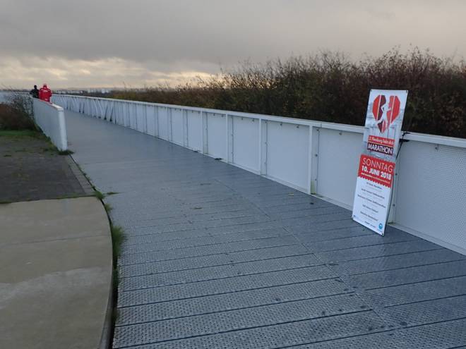 Runde 28 15.30 Uhr / Km 25,6 Nun war es wieder trocken. Das erleichterte natürlich das Fotografieren. Und da gab es wieder reichlich Motive. Und wie man sieht wurde am Horizontweg schon das Licht eingeschaltet (oben unter dem Handlauf). |