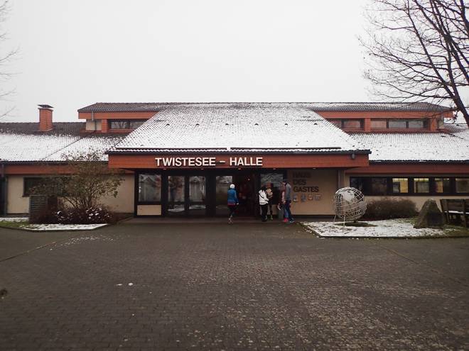 Twistesee-Halle 9.24 Uhr Veranstaltungszentrum war wieder die Twistesee-Halle. Da gab es Frühstück und Umkleidekabinen und vor allem eine gute Heizung. |