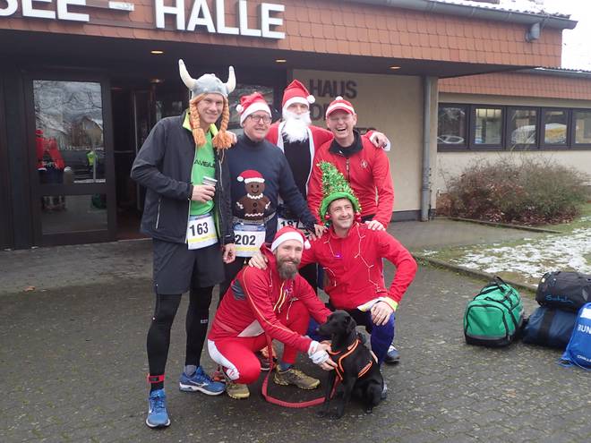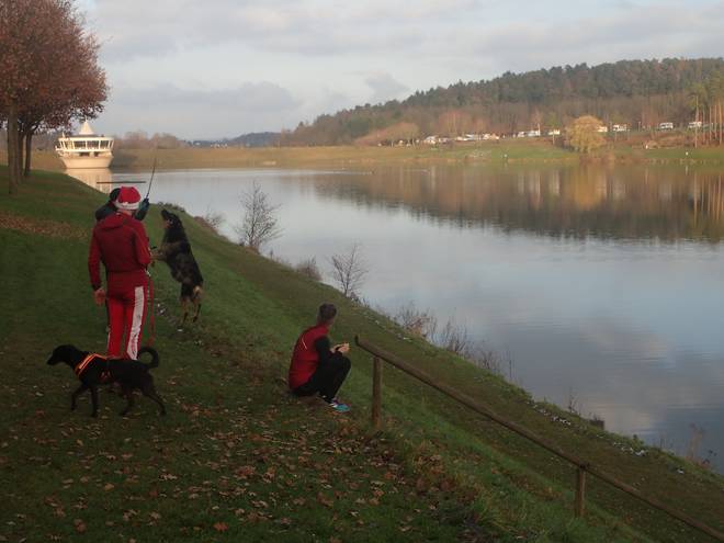 Twistesee-Halle 10.10 Uhr Eine Nikolaus-Mütze hatte ich auch auf, aber an diese Gruppe kam ich damit nicht heran. Naja... mehr verkleidet als der Hund war ich schon. :-) |