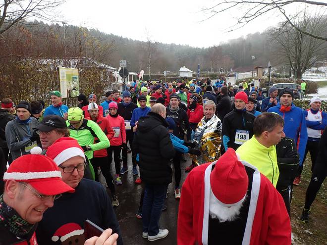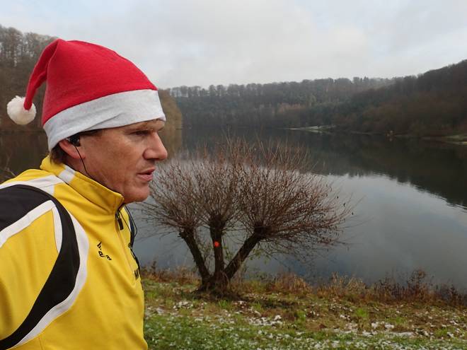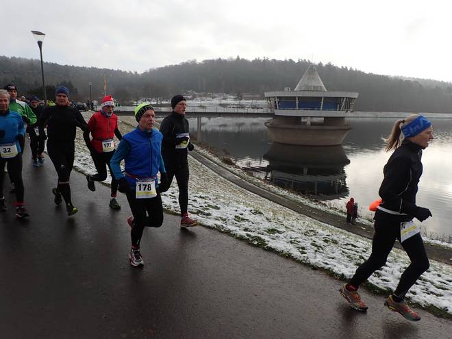 Twistetalsperre 10.28 Uhr 212 Starter hatten sich auf dem Staudamm versammelt. Im Jahr 2014 waren es noch 37 mehr. Die Verkleidungsrate war recht hoch. Allerdings 100% Weihnachtsmänner. |