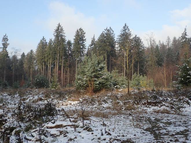 Langenwald / Großer Hundsrücken 11.46 Uhr / Km 12,4 Dank des kaum wehenden Windes blieb der wenige Schnee auf den dünnen Ästen liegen. |