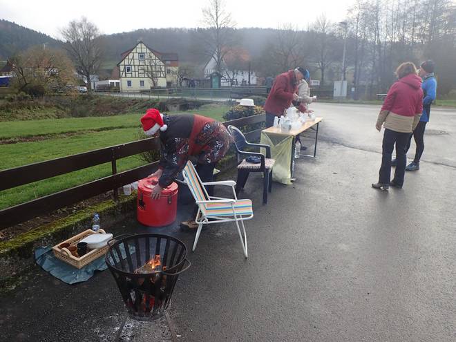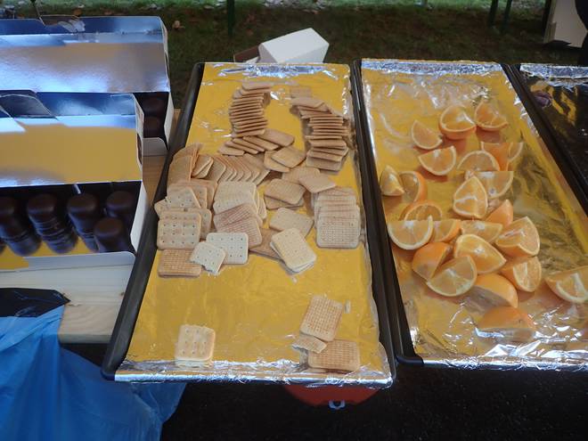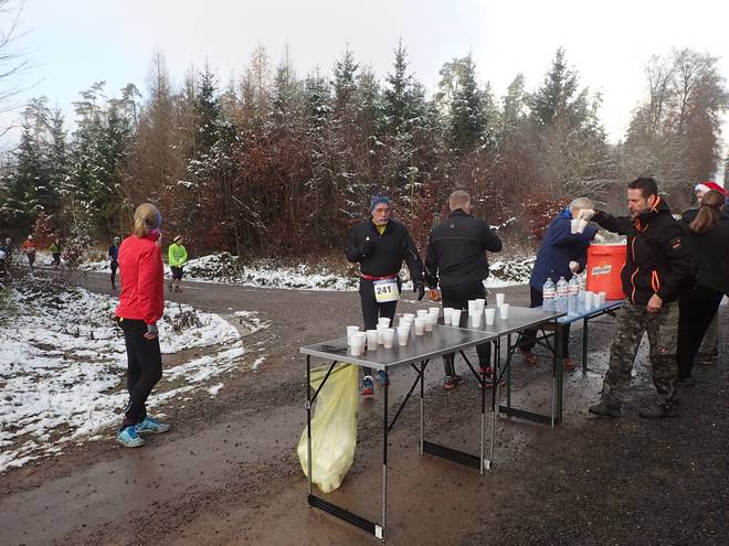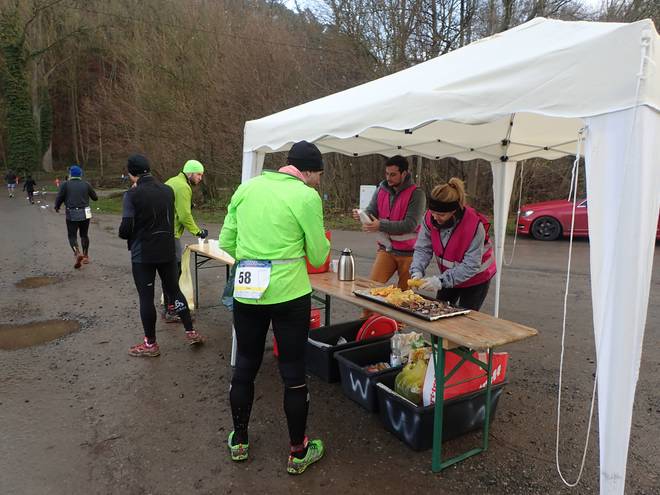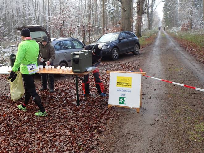 11.14 Uhr / Km 7,0 Neun Verpflegungsstellen gab es an der Strecke. Auch wenn davon nur sechs in der Ausschreibung auftauchen. Eine lief man doppelt an, machte insgesamt zehnmal Verpflegung. Ein wenig warmer Tee war schon sehr schön. |