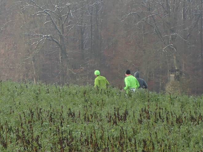 Apenberg 11.24 Uhr / Km 8,7 Aus dem Wald heraus ging es am Apenberg über die erste größere Freifläche. So fast ohne Wind war das aber kein Problem. |