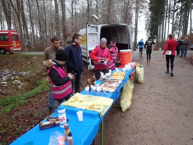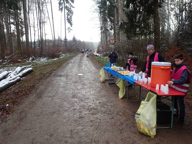Langenwald 13.34 Uhr / Km 29,9 Mitten im Wald einer der beiden Verpflegungsstände, die in der Ausschreibung nicht vermerkt waren. Dabei gab es diesen Stand auch schon 2012 und 2014. Und vermutlich auch die Jahre, wo ich nicht hier war. |
