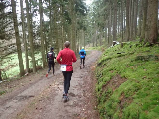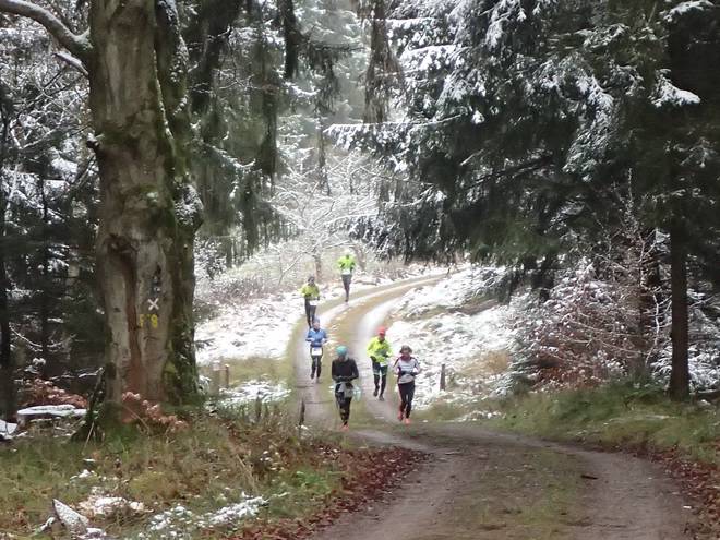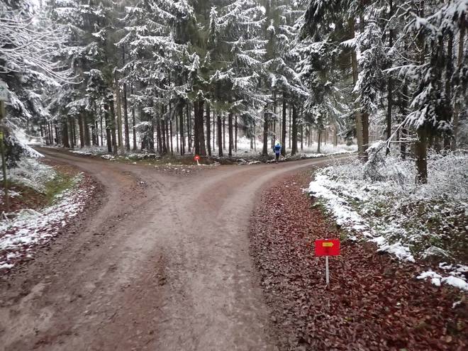 Großer Hundsrücken 11.52 Uhr / Km 13,5 Wer wollte konnte hier die Abkürzung ins Ziel nehmen. Man kam nach 750 Metern bei Kilometer 33 raus. Drei Läufern nutzten dieses Jahr diesen Notausgang. Eine gesonderte Wertung gab es dafür nicht. |