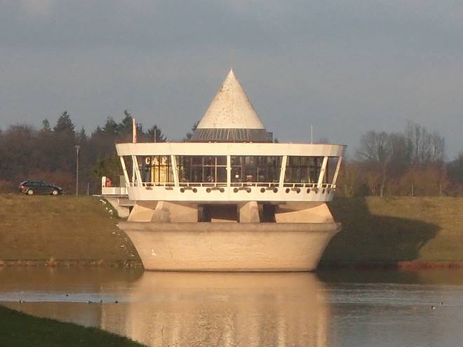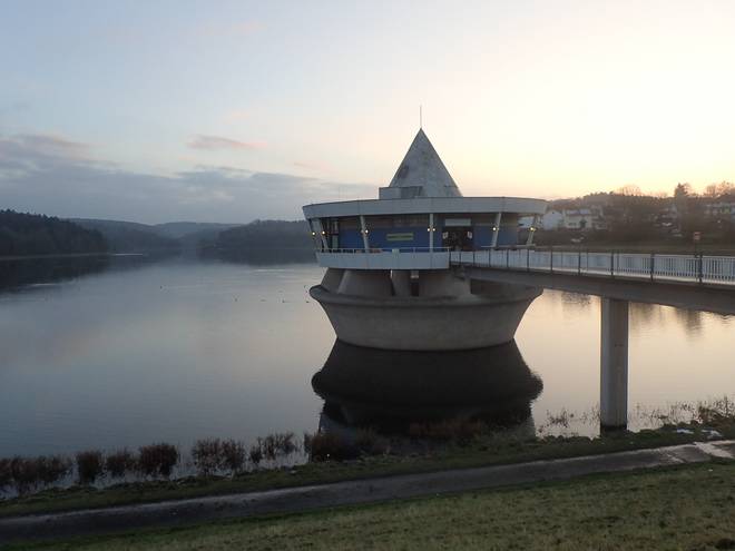 Twistesee 10.20 Uhr Das bekannte Café im See ist auf dem Überlauftrichter des Stausees gebaut. Der Start befindet sich auf dem Staudamm hinter dem Café. |
