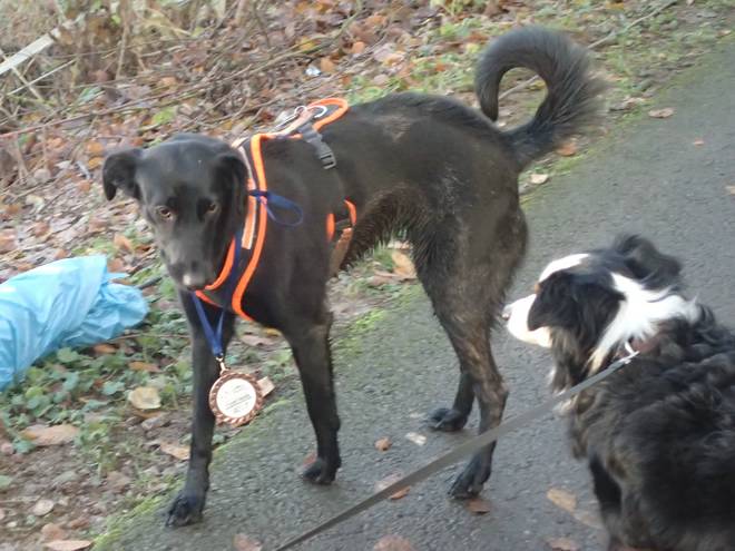 Twistesee 14.55 Uhr Ob das die Medaille des Herrchens ist oder ob er eine eigene bekommen hat, weiß ich nicht. Der andere Hund guckte aber neidisch bis bewundernd. |