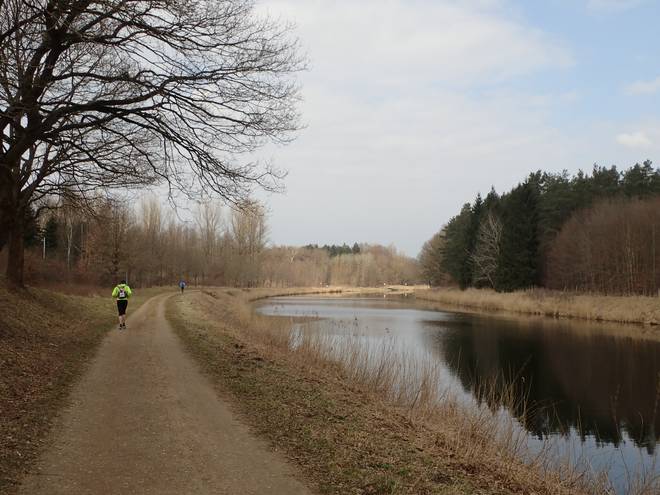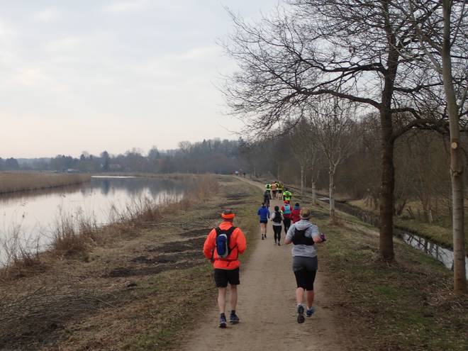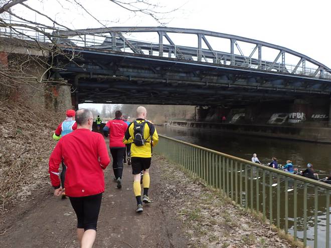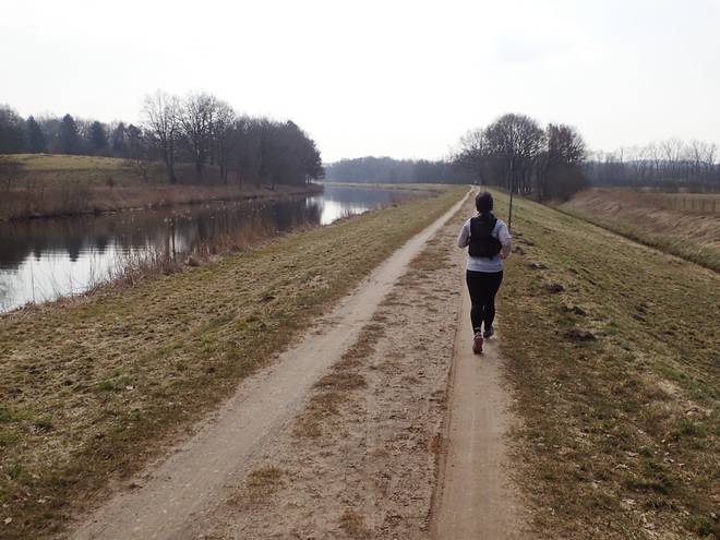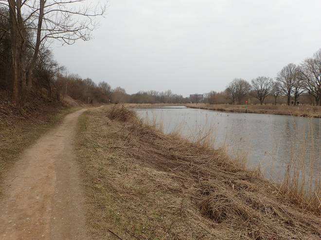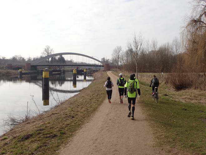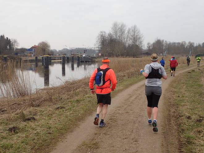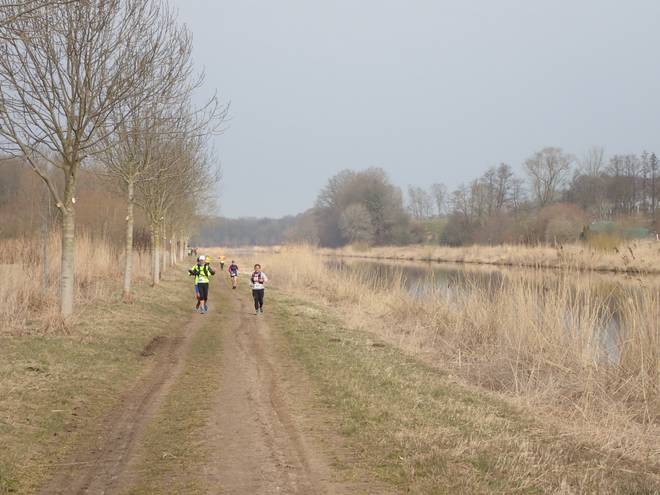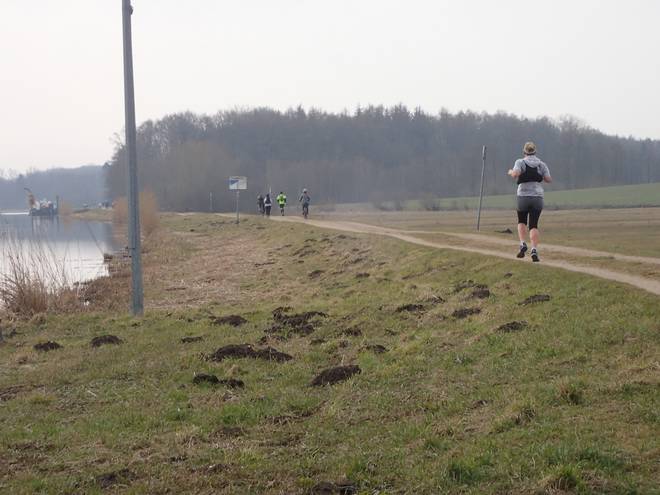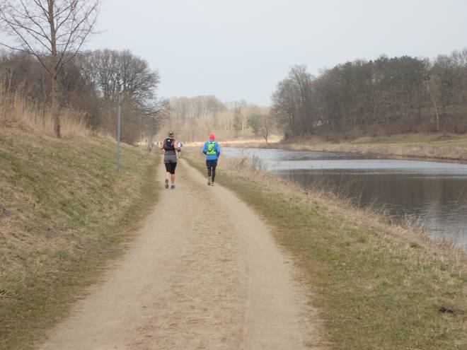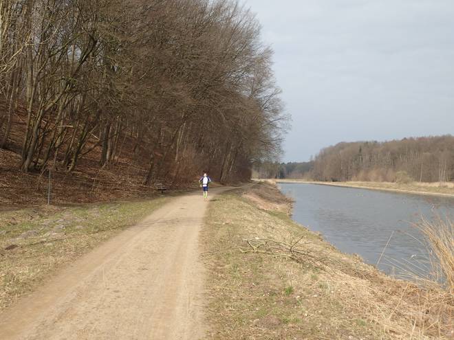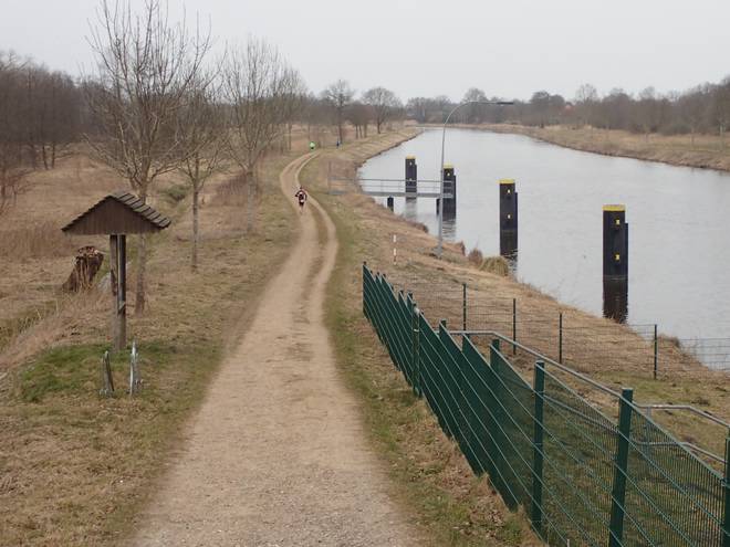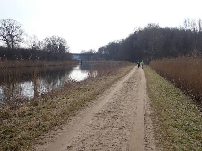 9.50 Uhr / Km 3,1 Nun ging es auf der rechten Kanalseite weiter. Der Boden war nicht immer eben, aber doch gut laufbar. |
