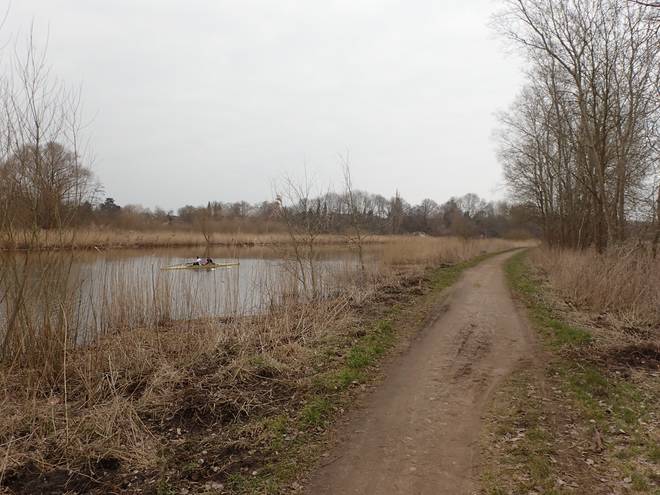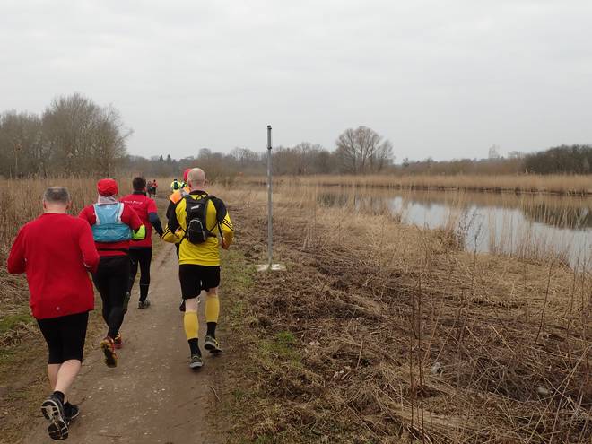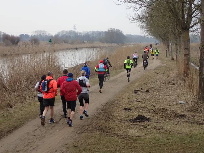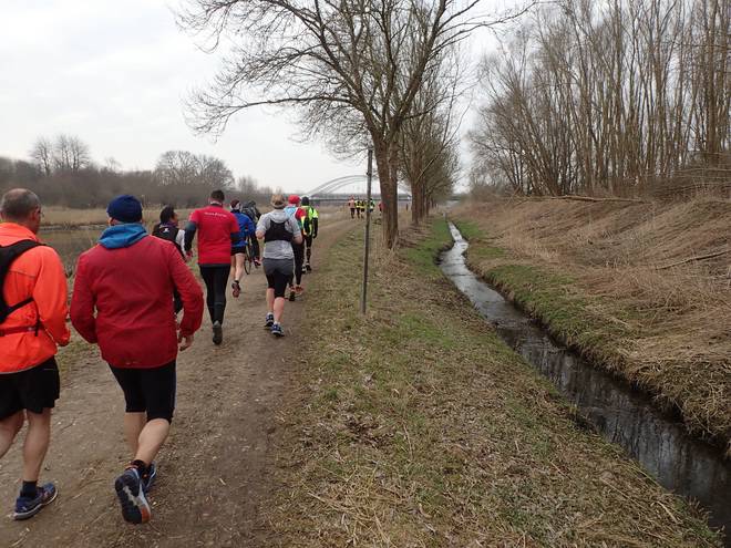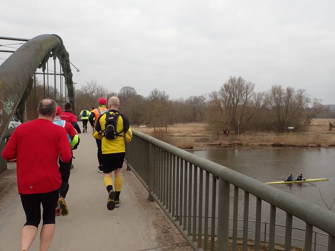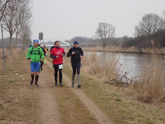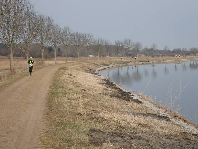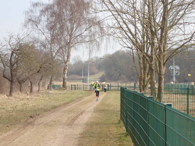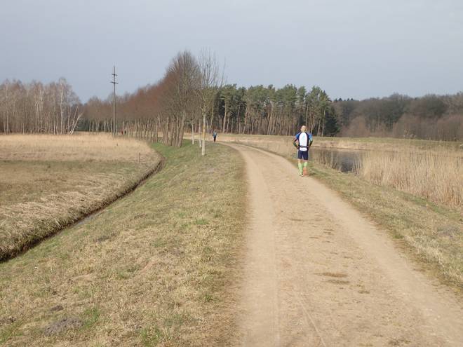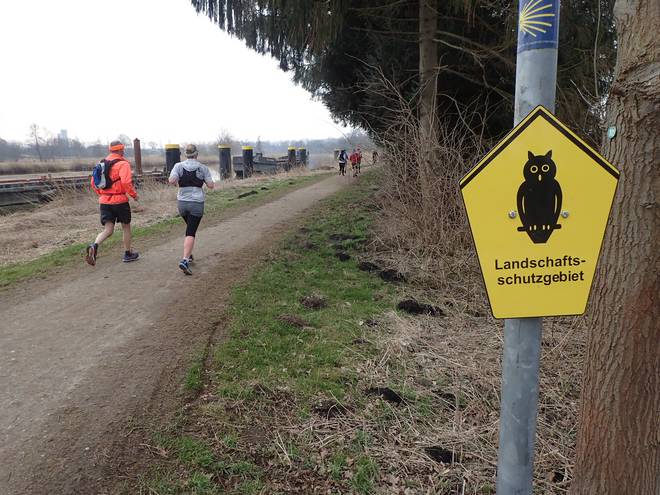 13.07 Uhr / Km 33,3 Plötzlich wieder Gegenwind. Gefühlt war ich schon den Hinweg immer gegen den Wind angelaufen. Und nun wieder? Ich sollte dringend mal mit den Leuten vom Wetterbericht darüber sprechen, was Süd-Westen genau ist. Auch bei nun 10°C war es mit Gegenwind ziemlich kalt. |