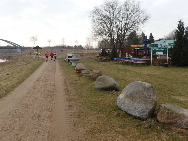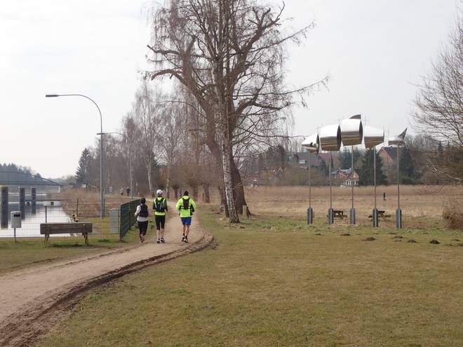 Schleuse Behlendorf 11.33 Uhr / Km 19,5 Mit meinem Tempo überholte ich nun ein paar Läufer. Aber ich suchte was ganz anderes, was mir die Zeit schon wieder rauben würde. |