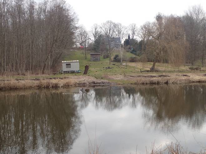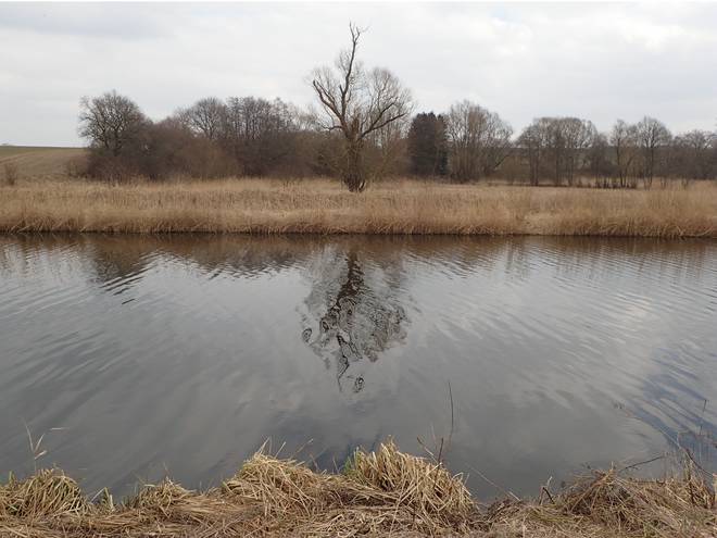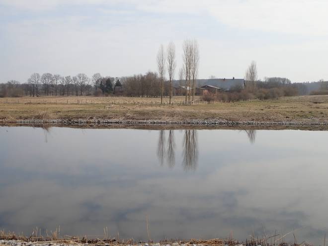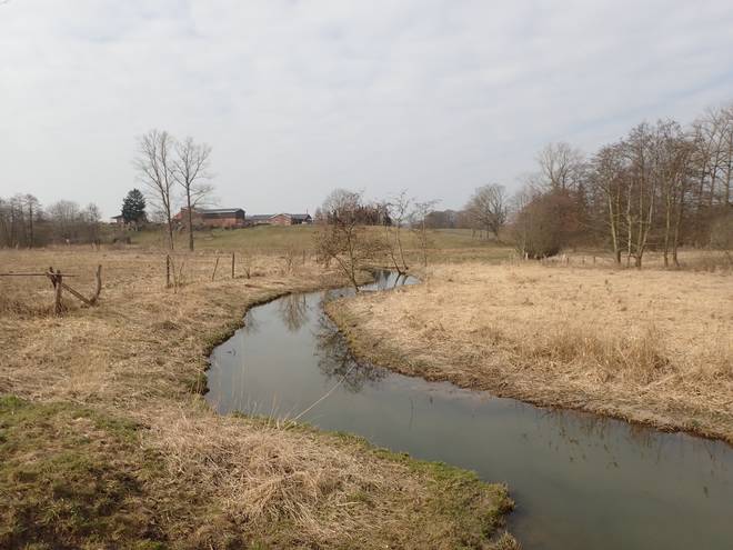Kühnsen 11.50 Uhr / Km 22,5 Die Suche nach einer Toilette konnte ich wohl vergessen. Hier gab es weit und breit keine. Letztendlich kam ich aber in ein kleines Wäldchen diesseits des Baches. Die Erlösung nach beinahe 14 Kilometern zunehmender Magenprobleme. |