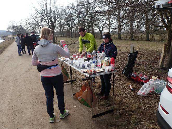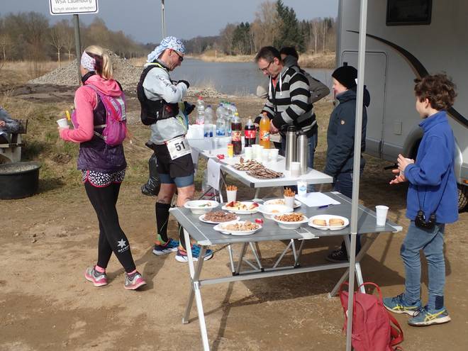 Krummesse 14.50 Uhr / Km 51,1 Nun wurden meine Beine doch etwas schwer, aber wollte den Temposchnitt von noch 5:59 Min/Km auf der Uhr gerne bis zum Verpflegungsstand retten. |