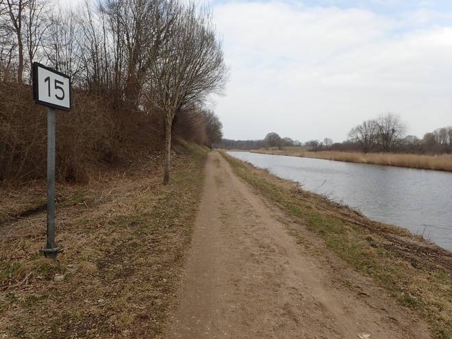 14.08 Uhr / Km 44,1 Offizielle Kilometerangabe an der Strecke gab es nicht. Aber je länger ich mir die Schilder entlang des Kanals anschaute, desto mehr kam mir die Idee, daß man sich mit denen hätte orientieren können, wenn man nur früh genug auf die Idee gekommen wäre. |
