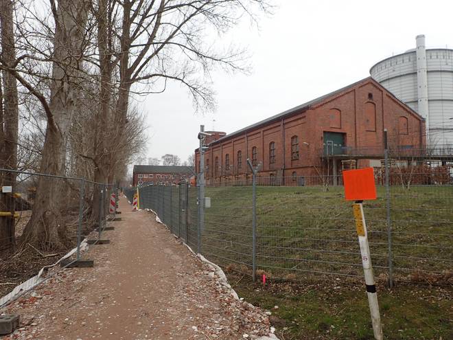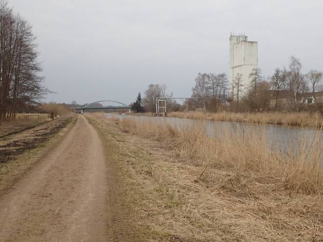 Bei der Gasanstalt 9.32 Uhr / Km 0,35 Nach 350 Meter erreichten wir dann den Kanal, dem wir nun 60,3 Kilometer folgen sollten. |