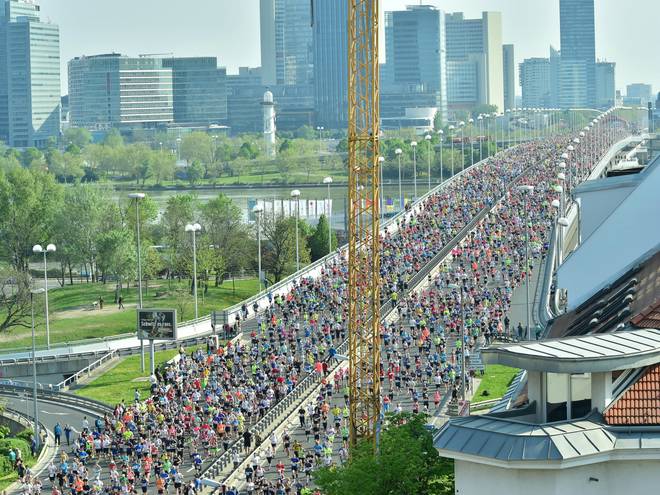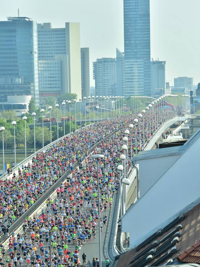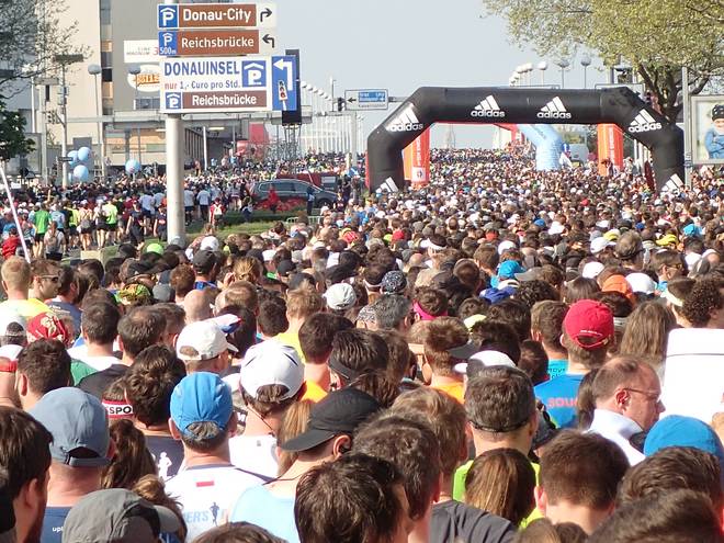 Reichsbrücke 9.25 Uhr / Km 0,5 Hier werden auch immer die spektakulären Luftaufnahmen von den Läufermassen nach dem Start gemacht, die in keinem Film über den Wien-Marathon und die in keiner Werbung fehlen. |