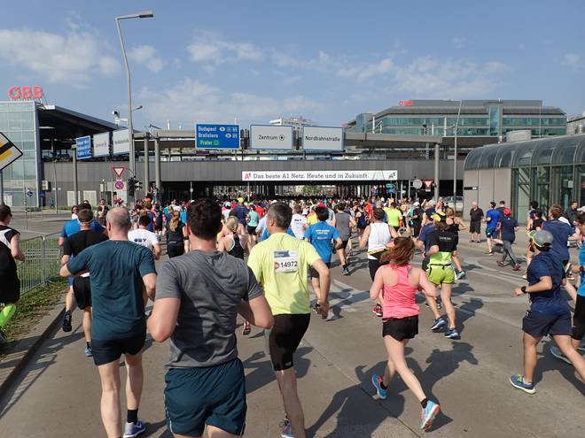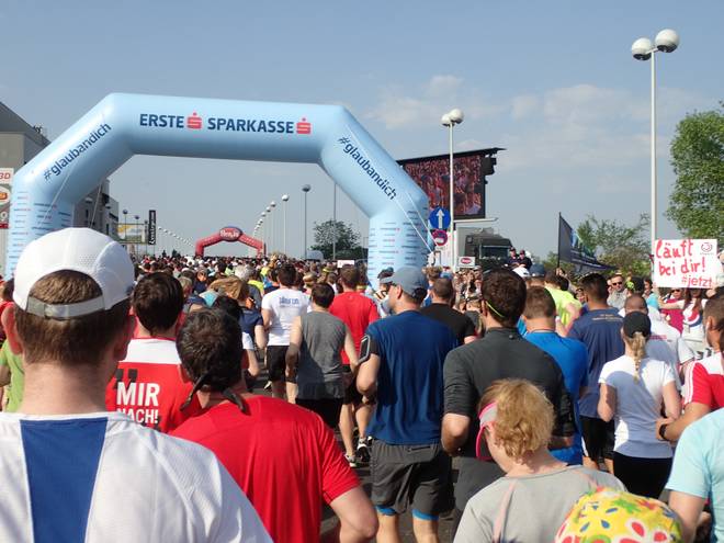 Wagramer Straße 9.17 Uhr Welches von den vielen Toren da vorne war eigentlich der Start? Schon wieder eine gute Frage. Keine Ahnung. Da blieb nur die Paderborner Methode: Man suche den Boden nach der Start-Matte ab. |