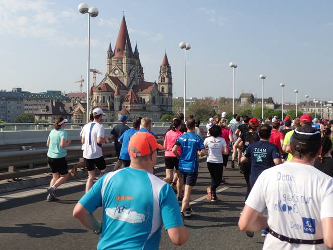 Praterstern 9.38 Uhr / Km 2,6 Links oben ein kurzer Blick auf das berühmte Riesenrad vom Prater. |