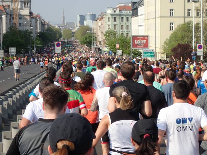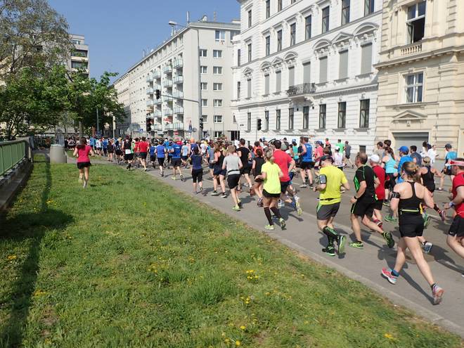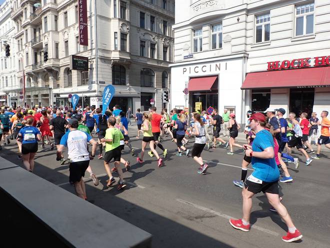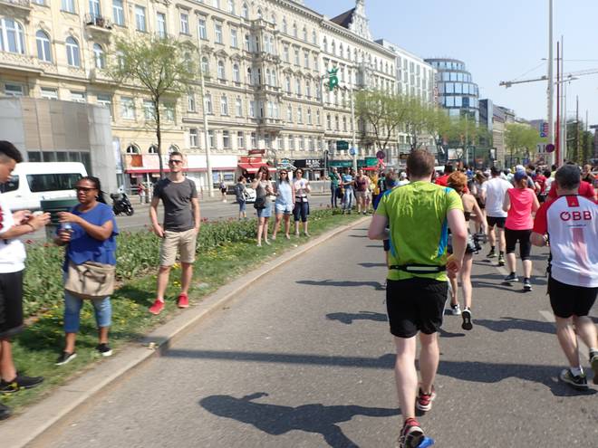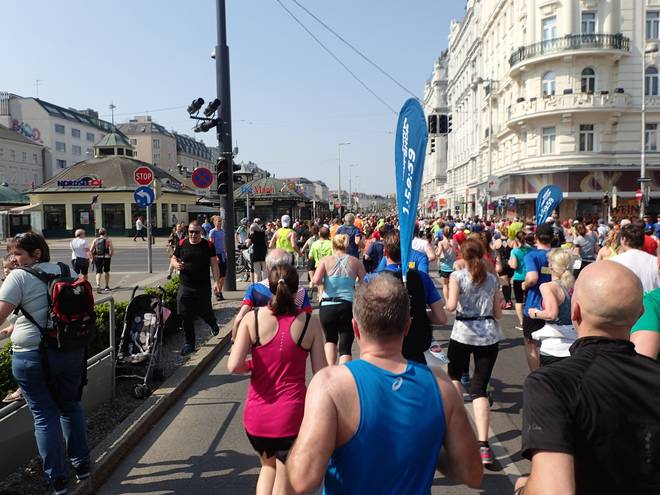Kärntner Ring 10.24 Uhr / Km 10,5 Aber wie sollte man hier auch Tempo machen? Selbst der breite Ring war noch zu schmal für so viele Läufer. |
