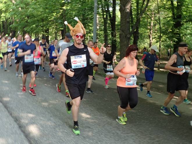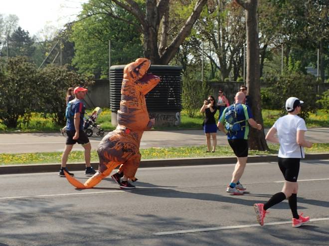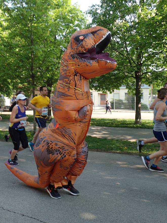 Lasallestraße 9.35 Uhr / Km 2,0 Dinosaurier? Also bei dem Wetter in Kostüm laufen... alle Achtung. |