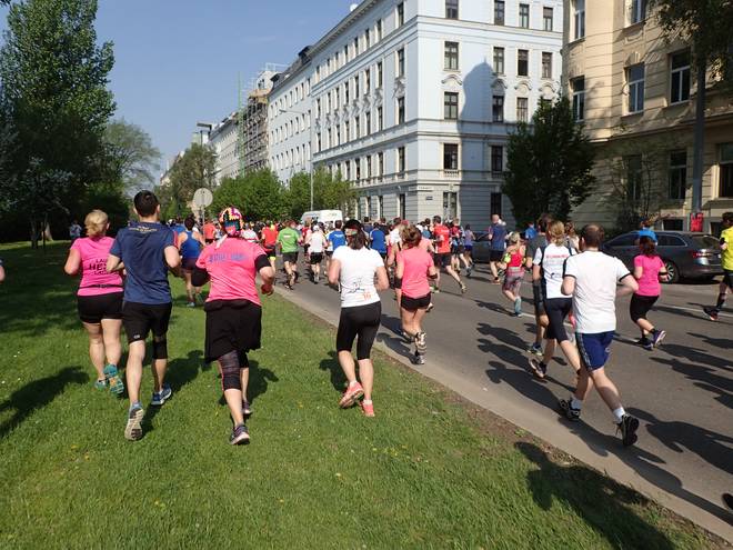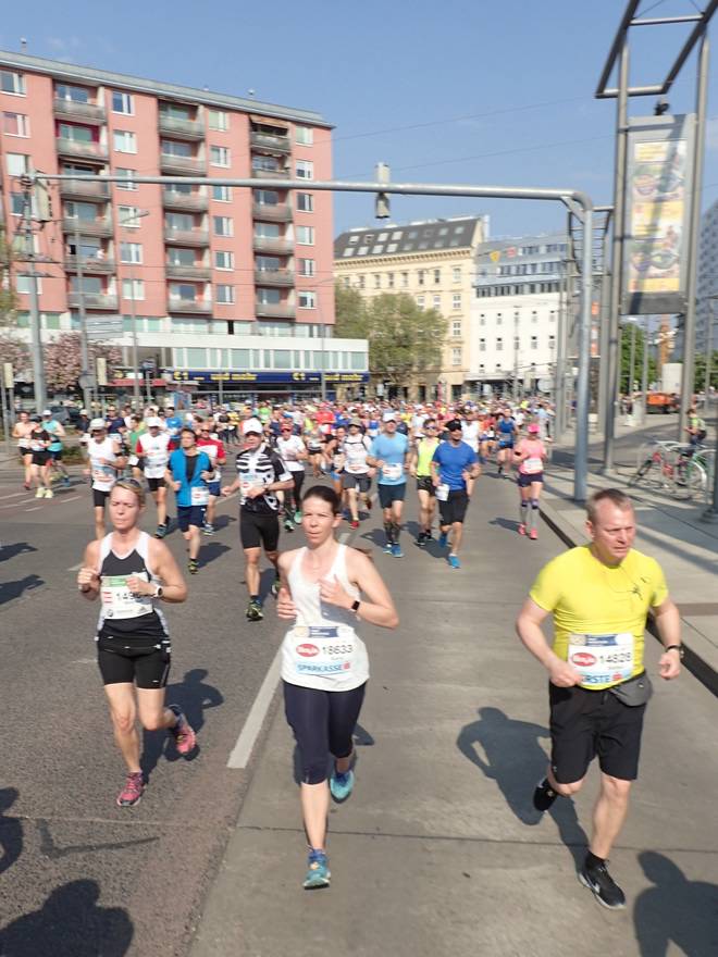Mariahilfer Straße 11.04 Uhr / Km 17,3 Nach dem Staffelwechsel war nun mehr Platz zum Laufen. Eigentlich hatte ich eher neue Unruhe im Feld erwartet, aber vielleicht war auch einfach die Strecke breiter. |
