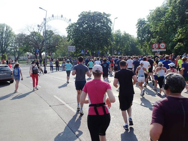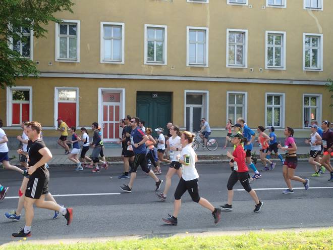 Lasallestraße Praterstern 9.35 Uhr / Km 2,0 Wir Läufer aus dem Block 3 liefen den langen Weg um den Praterstern, während die aus Block 4 die Abkürzung nahmen. Dafür hatten wir am Start ein wenig Vorsprung. Und es war verboten, die Fahrbahn von einen Block in den anderen zu wechseln. |
