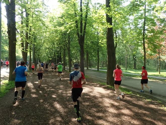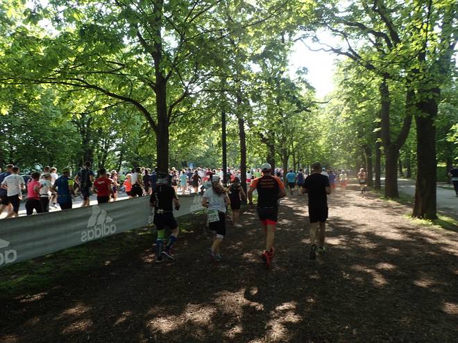 Hauptallee 9.44 Uhr / Km 3,6 Der Weg hier zwischen den Bäumen gehörte nicht zur Strecke. Aber hier federte der Boden so schön, es war nicht so voll und mehr Schatten gab es auch. |