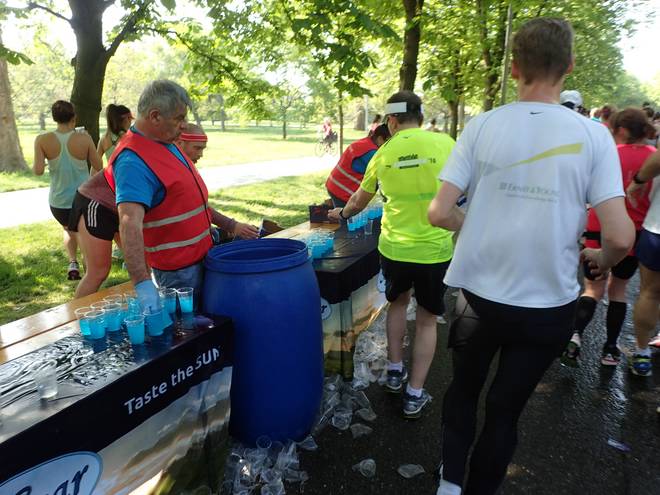 Linke Wienzeile 10.50 Uhr / Km 15,0 Der dritte Verpflegungsstand. Endlich wieder trinken. Und Abkühlung. |