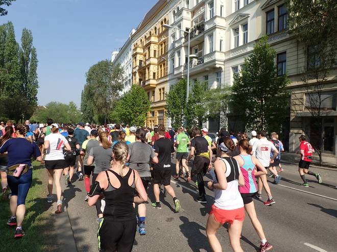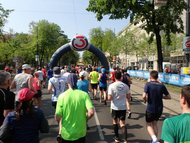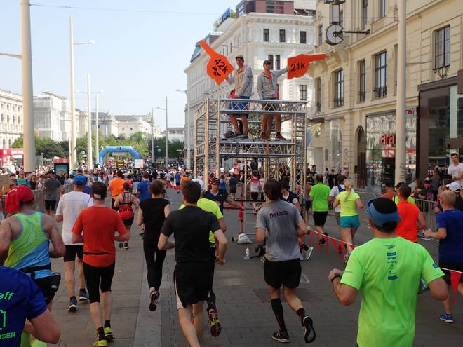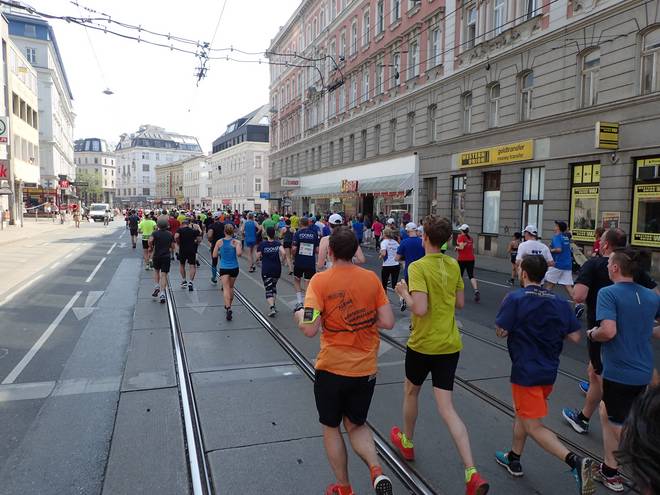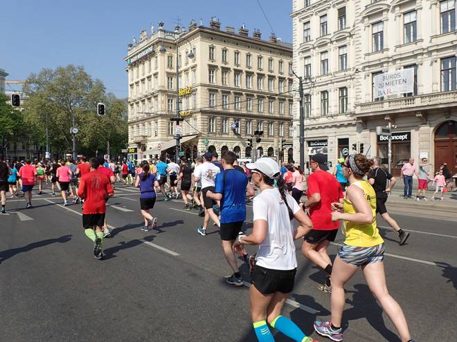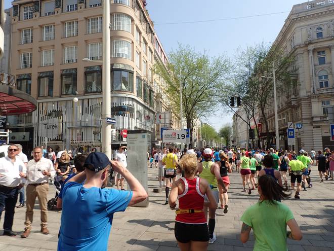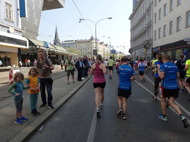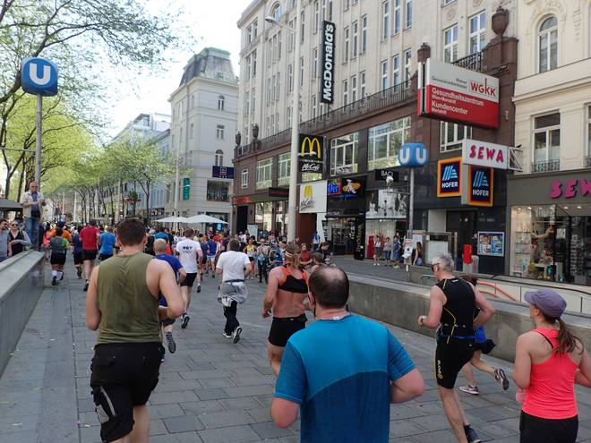 Mariahilfer Straße 11.17 Uhr / Km 19,7 Dann kam es zur Feldtrennung Marathon/Halbmarathon. Bis dahin waren es zwar noch gut 300 Meter, aber je früher man sich einordnete, desto besser. |