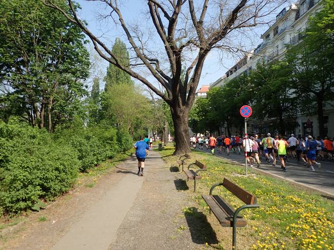 Linke Wienzeile 10.33 Uhr / Km 12,0 Man konnte versuchen, über den Bürgersteig Anschluß zu halten, aber es war alles sehr eng. Die Idee hatte ich nicht alleine und diese Überholspur wurde auch von langsamen Läufern genutzt. War ja alles inoffiziell. |