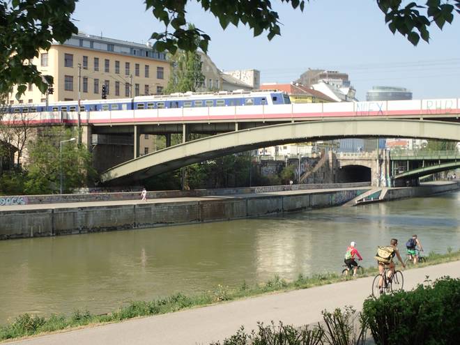 Schüttelstraße 10.10 Uhr / Km 8,0 Der Donaukanal und eine Eisenbahnbrücke. |