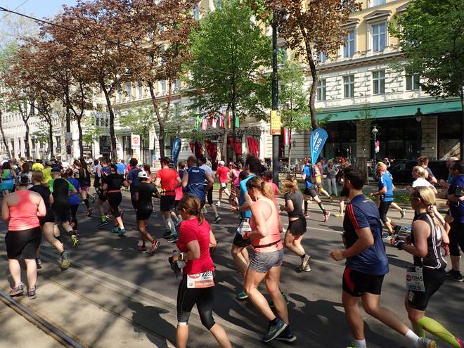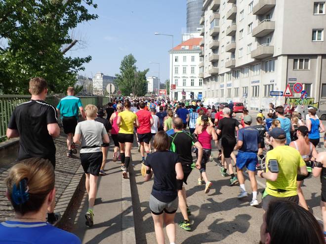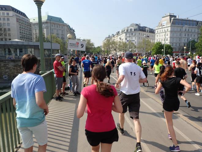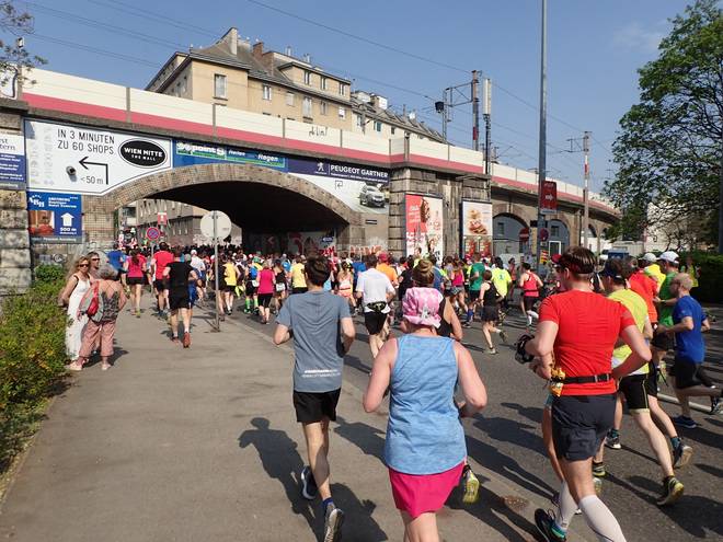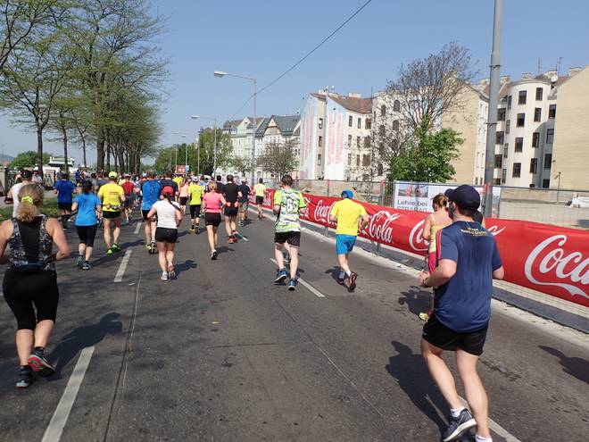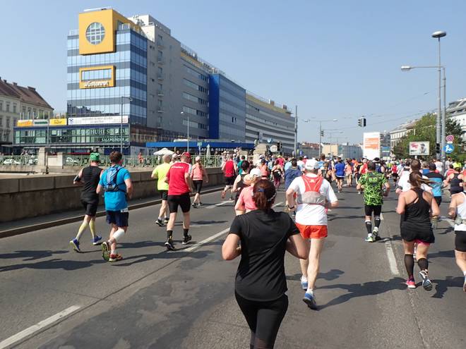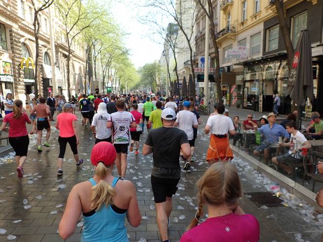 Linke Wienzeile 10.48 Uhr / Km 14,7 Die anfängliche Euphorie über den Marathon hatte sich etwas abgekühlt. Diese endlos lange Wienzeile war voll, eng, nervig und visuell langweilig. |