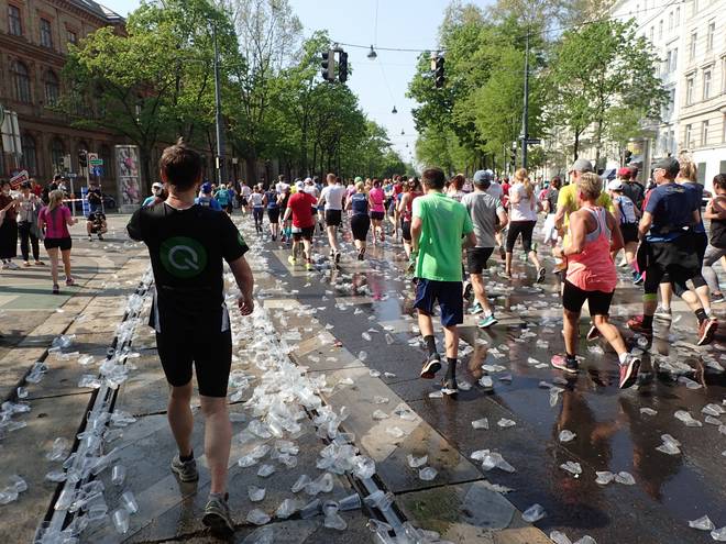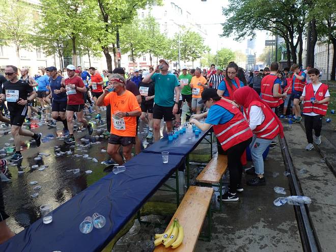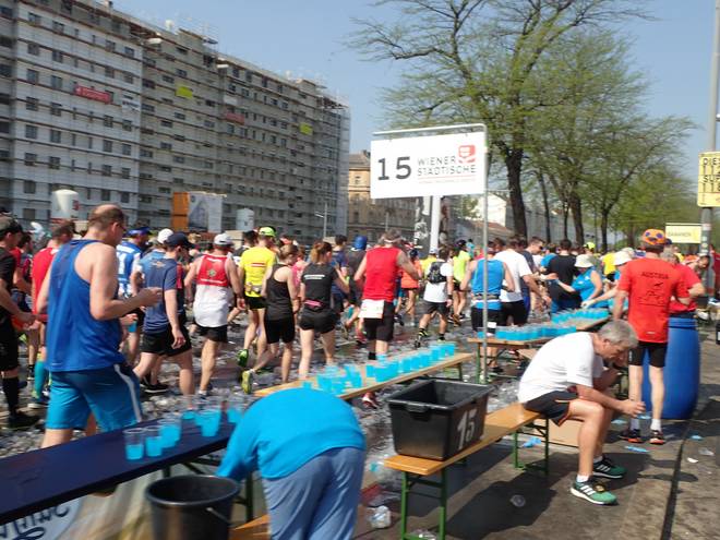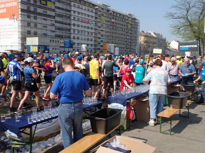 Stubenring 10.17 Uhr / Km 9,4 Verpflegungsstand Zwei. Da kam man mit dem Auffüllen der Becher schon kaum noch nach. |