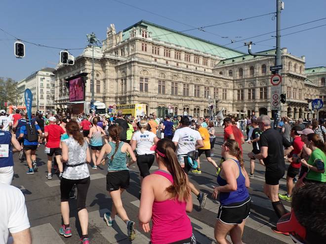 Kärntner Ring Opernring 10.25 Uhr / Km 10,7 Nun ging es an der Wiener Staatsoper vorbei. Was die Sehenswürdigkeiten angeht, war die Strecke grandios. |