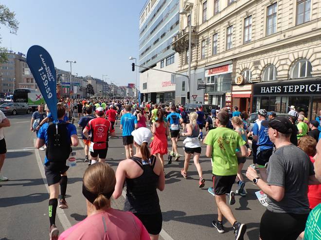 Linke Wienzeile 10.29 Uhr / Km 11,3 Ich versuchte nun, irgendwie an den Zeitläufern mit den blauen Fahnen dran zu bleiben. Aber das war alles andere als leicht. |