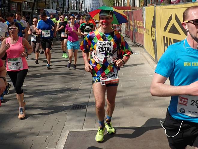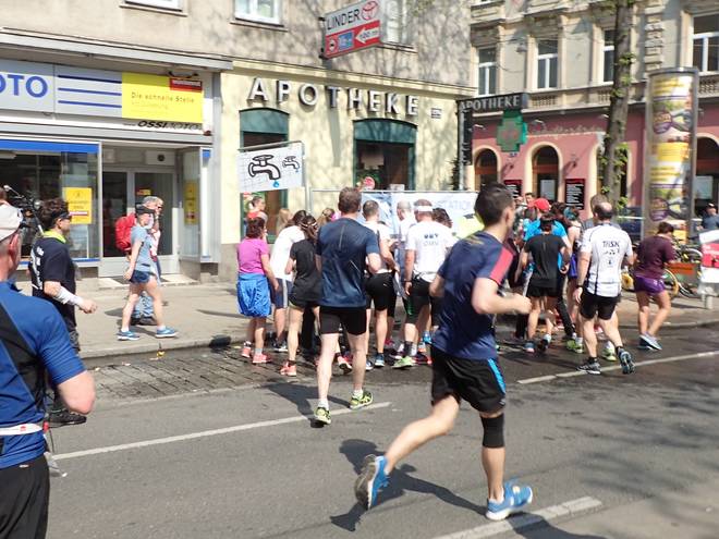 Mariahilfer Straße 11.16 Uhr / Km 19,6 Der vierte Verpflegungsstand war passiert. Wieder hatte ich mir drei Becher Iso in den Hals und einen Becher Wasser über den Kopf gegossen. |