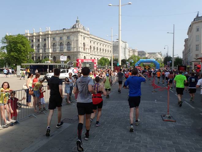 Mariahilfer Straße Museumsplatz 11.18 Uhr / Km 19,9 Wie sehr die Hitze den Läufern zusetzte zeigte die Anzahl der Umsteiger. Von den 6786 als Marathon-Läufer Gestarteten entschieden sich 1355, das Rennen als Halbmarathon-Läufer zu beenden, was nach Ausschreibung problemlos möglich war und zu einer offiziellen Halbmarathon-Wertung mit Medaille führte. Links das Kunsthistorische Museum. |