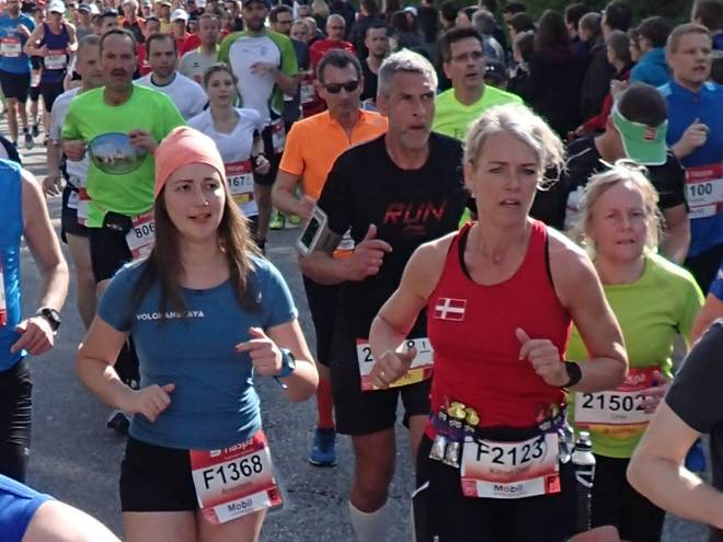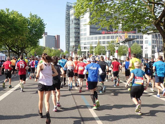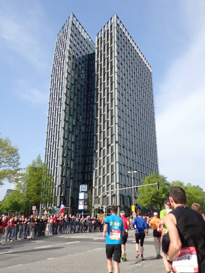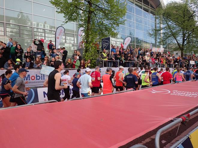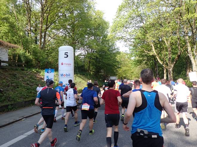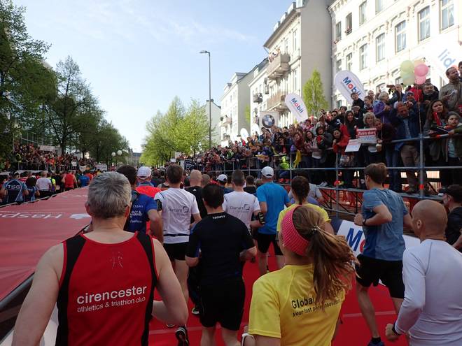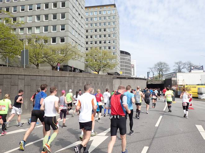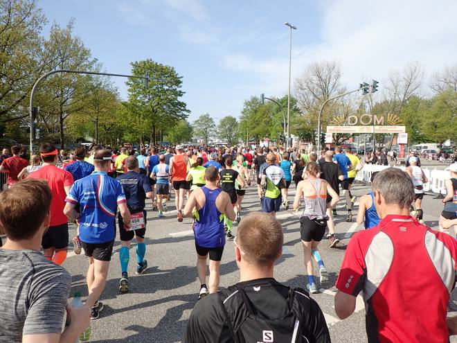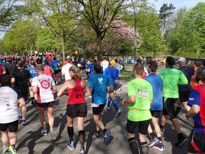 Glacischaussee Helgoländer Allee 9.42 Uhr / Km 1,1 Im Grunde hatte ich dasselbe Ziel wie eine Woche zuvor in Wien. Mit 5:40 Min/Km ins Rennen gehen und dann unter vier Stunden ins Ziel kommen. |